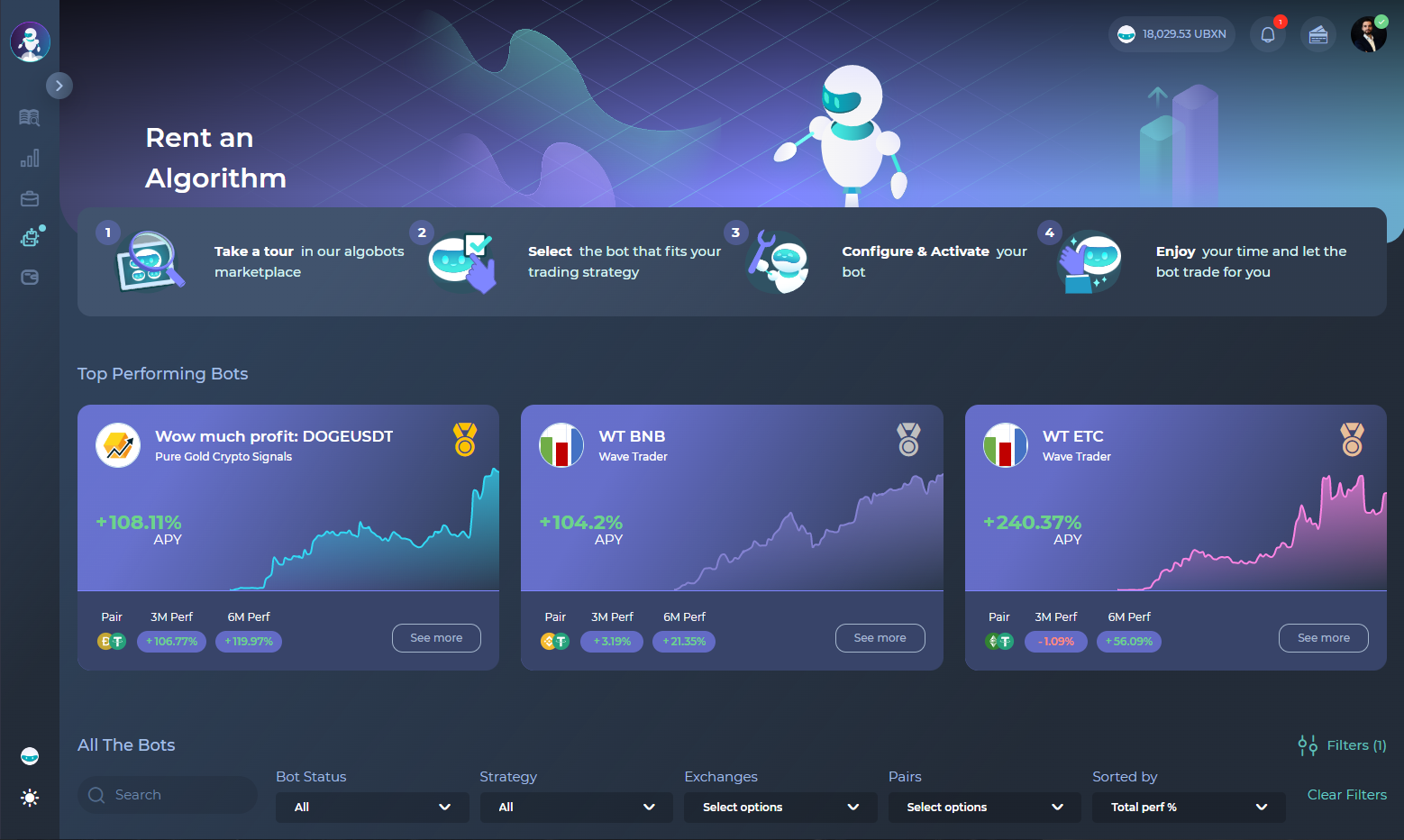 Added very recently on UpBots, this feature allows to rent algorithms on a monthly fee basis, payable in MBXN or USD.